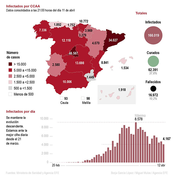 Con estos datos, son 16.972 los fallecidos desde el inicio de la pandemia y 166.019 las personas infectadas. Además, el total de recuperados asciende a 62.391 ya que en las últimas horas se han curado 3.282 personas.