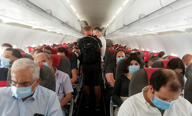 La tripulación suma a los avisos de seguridad uno específico por la COVID-19. La sobrecargo nos recuerda que el uso de la mascarilla es obligatorio, aunque nos pide, y es textual, que si en caso de despresurización de la cabina hay que utilizar las mascarillas de oxígeno, primero debemos quitarnos las nuestras.